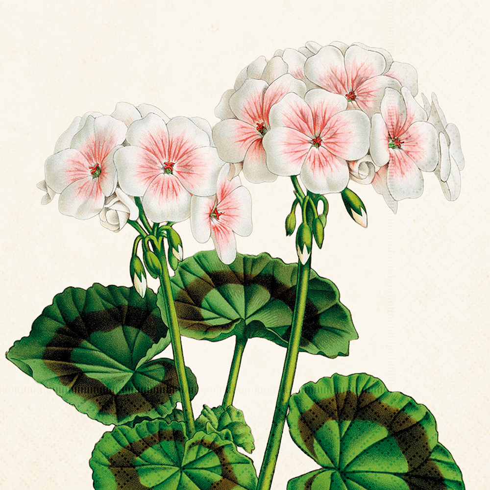 Kaunis paperinen lounasservetti, jossa on valkoiset pelargonit vaalealla taustalla. Raikas ja pirteä kuosi sopii hyvin kesäpöytään, juhliin, kahvihetkiin tai lahjapaketin koristeluun.